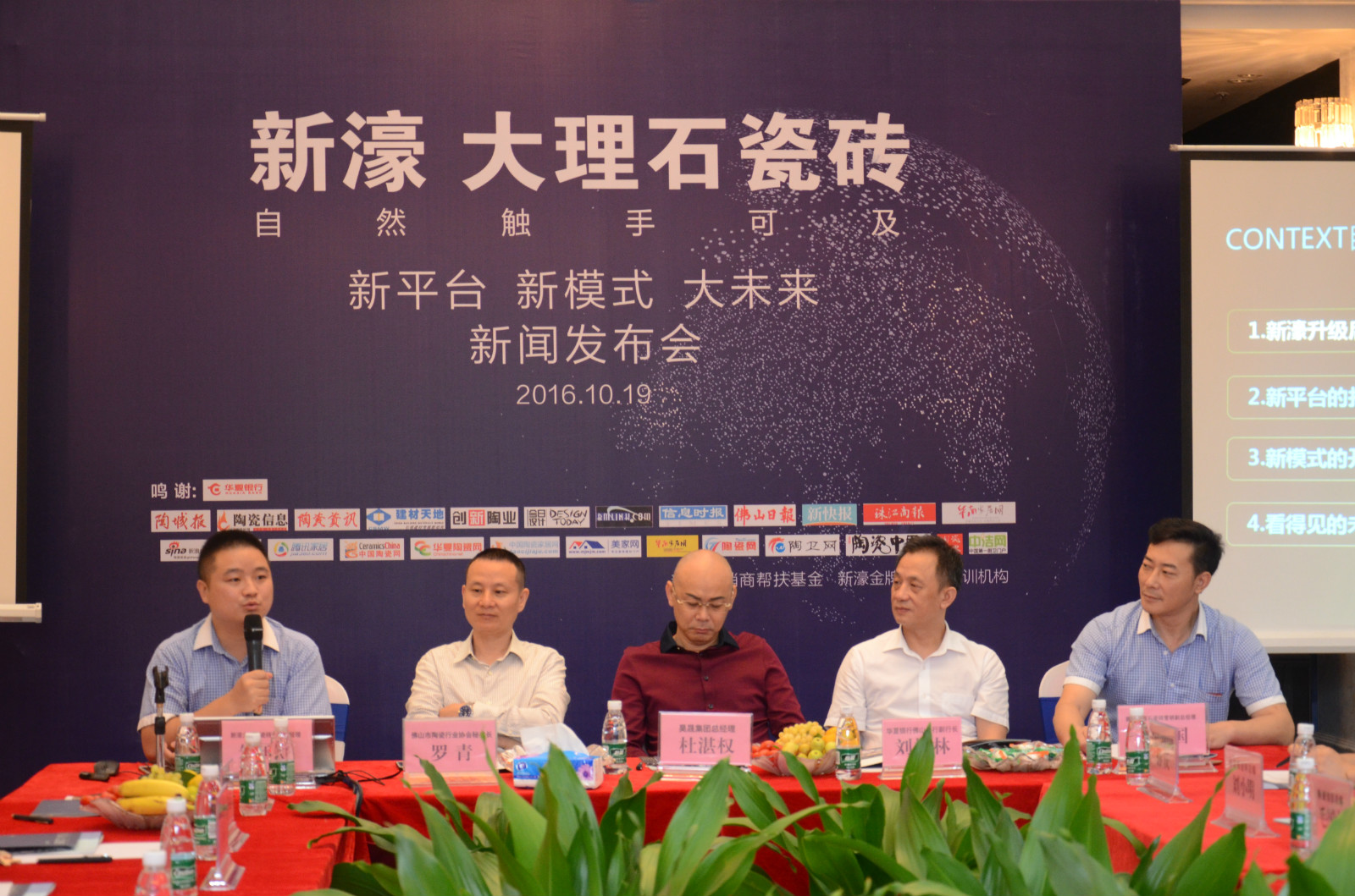 10月19日上午,新濠大理石瓷磚“新平臺 新模式 大未來”新聞發布會在佛山新濠展廳召開。華夏銀行佛山分行副行長劉振林、金融部總經理謝文斌,佛山陶瓷行業協會秘書長羅青,昊晟集團總經理杜湛權、財務總經理羅燕清,新濠大理石瓷磚品牌營銷總經理朱國亮、副總經理柯寓國,產品事業部策劃總監孫慶,以及來自行業的近30家主流媒體記者等出席發布會。