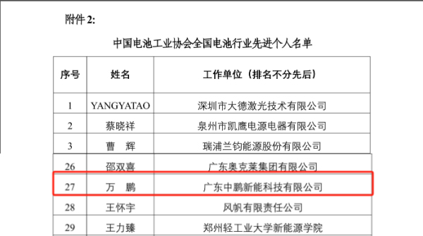 活動現(xiàn)場,中國電池工業(yè)協(xié)會向獲獎單位和個人進(jìn)行了頒獎授牌。中鵬科技董事長萬鵬榮獲“全國電池行業(yè)先進(jìn)個人”榮譽(yù)稱號。